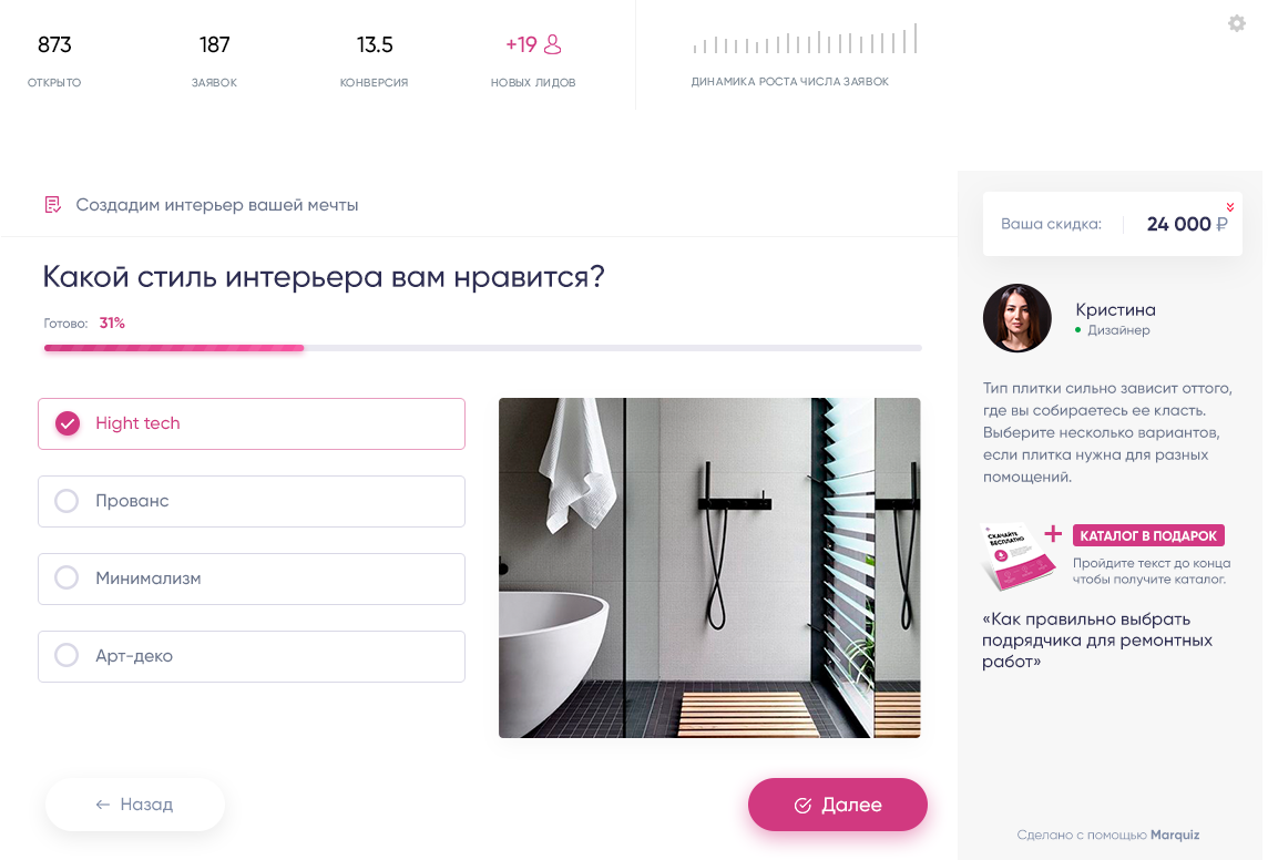 Quizzes are a relatively new tool in marketing. It helps increase the site conversion for about several times, by creating an interactive questionnaire. The purpose is to give visitors a solution which they receive being involved in a simple test. With Marquiz we develop the most affordable product and make it easy to use. The simpler and more visual the interface will be, the easier to use and apply in real business.