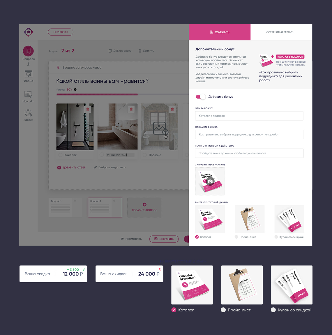 In addition to discounts, the user is offered to set up bonuses: a free catalog, a personal discount or a price list. This helps get a greater involvement, and to mean more interested customers.