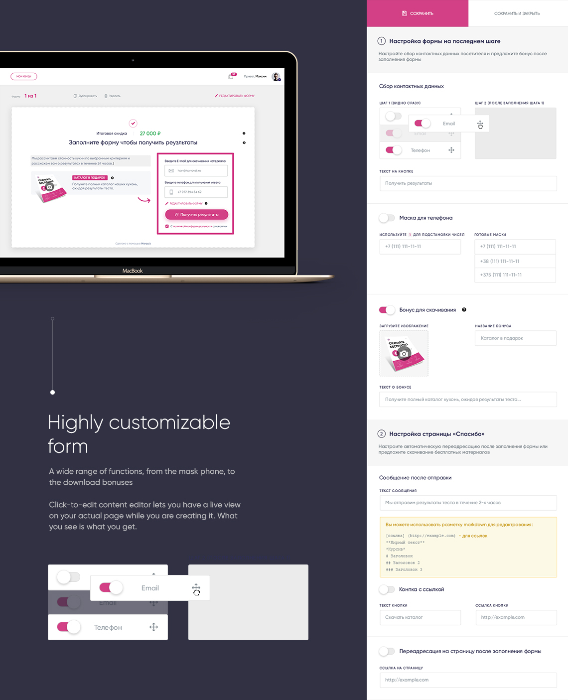 The form capture is the most important stage, a relevant configuration plays a decisive factor in the quiz effectiveness. All the settings are available and fully customizable in the editor, with a wide range of functions, from the mask phone, to the download bonuses.