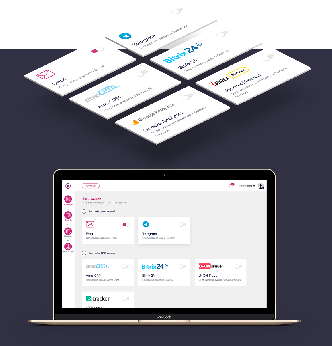 Integrations are designed in a cards form system, divided into 3 main areas: Analytics, CRM systems, and notification settings. We wrote a detailed step-by-step instruction for each of them.