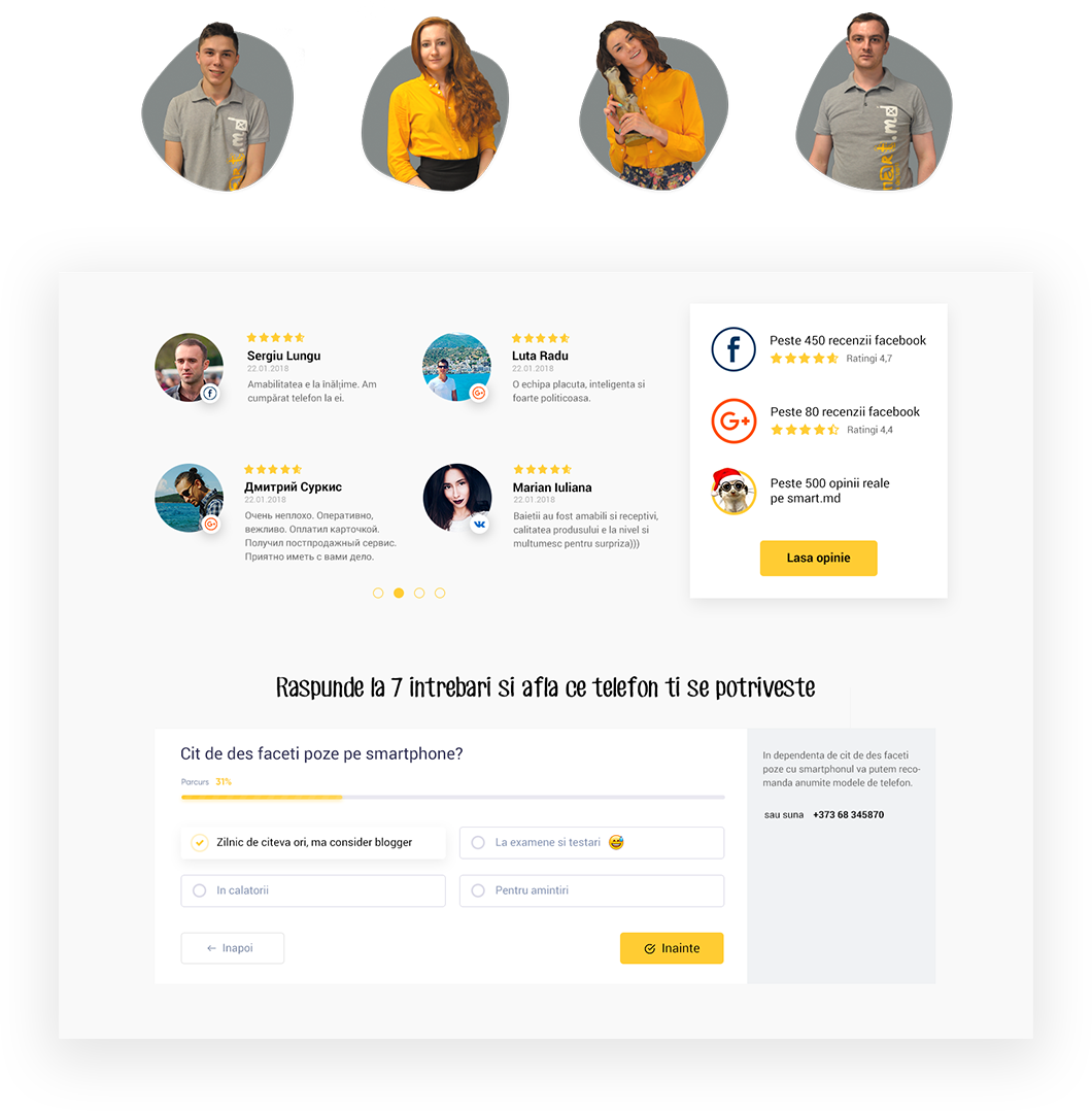 Smart.md is a pretty fun team of youngsters who love gadgets and technological progress. The only ones in the country witch collect feedback after each purchase with convenient terms of technical assistance and return. I designed a block with feedbacks that reflects the team's friendliness and shows trusting relationship with сustomers.