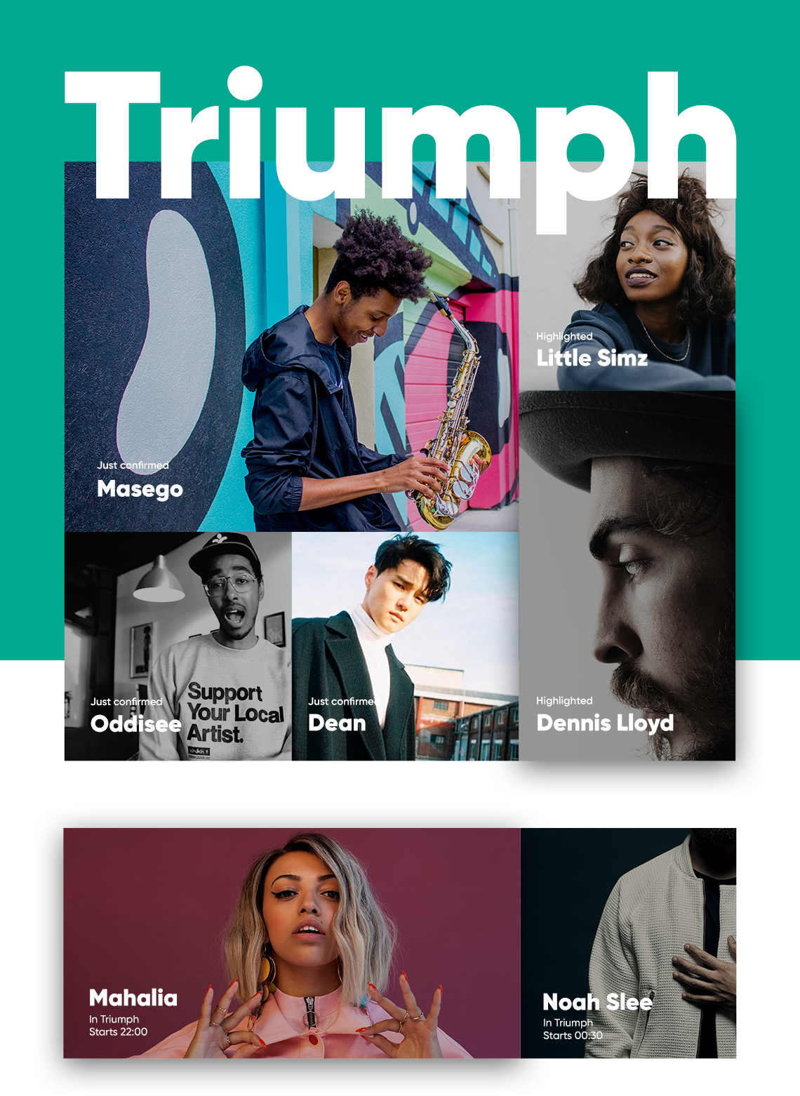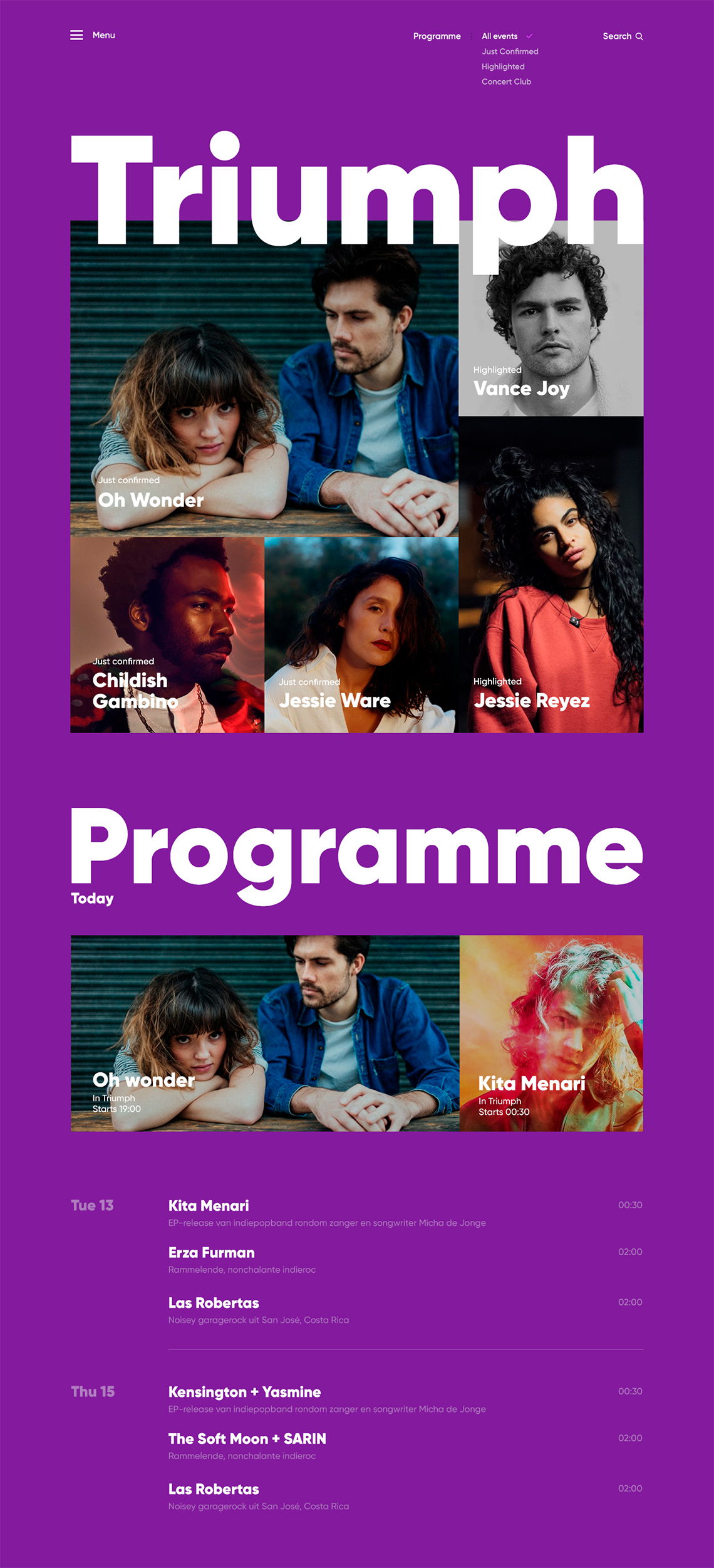 How do actual musical communities use online technology and all its possibilities to provide you, the guest, with a better experience? How do they use it to improve the artists' connection to their audience? Triumph aims to answer these two main questions. I designed this concept to share my vision, so anyone can benefit from this experience.