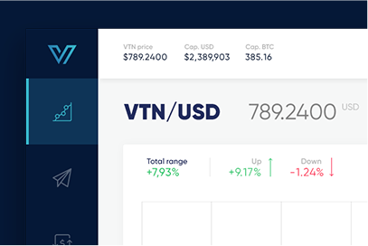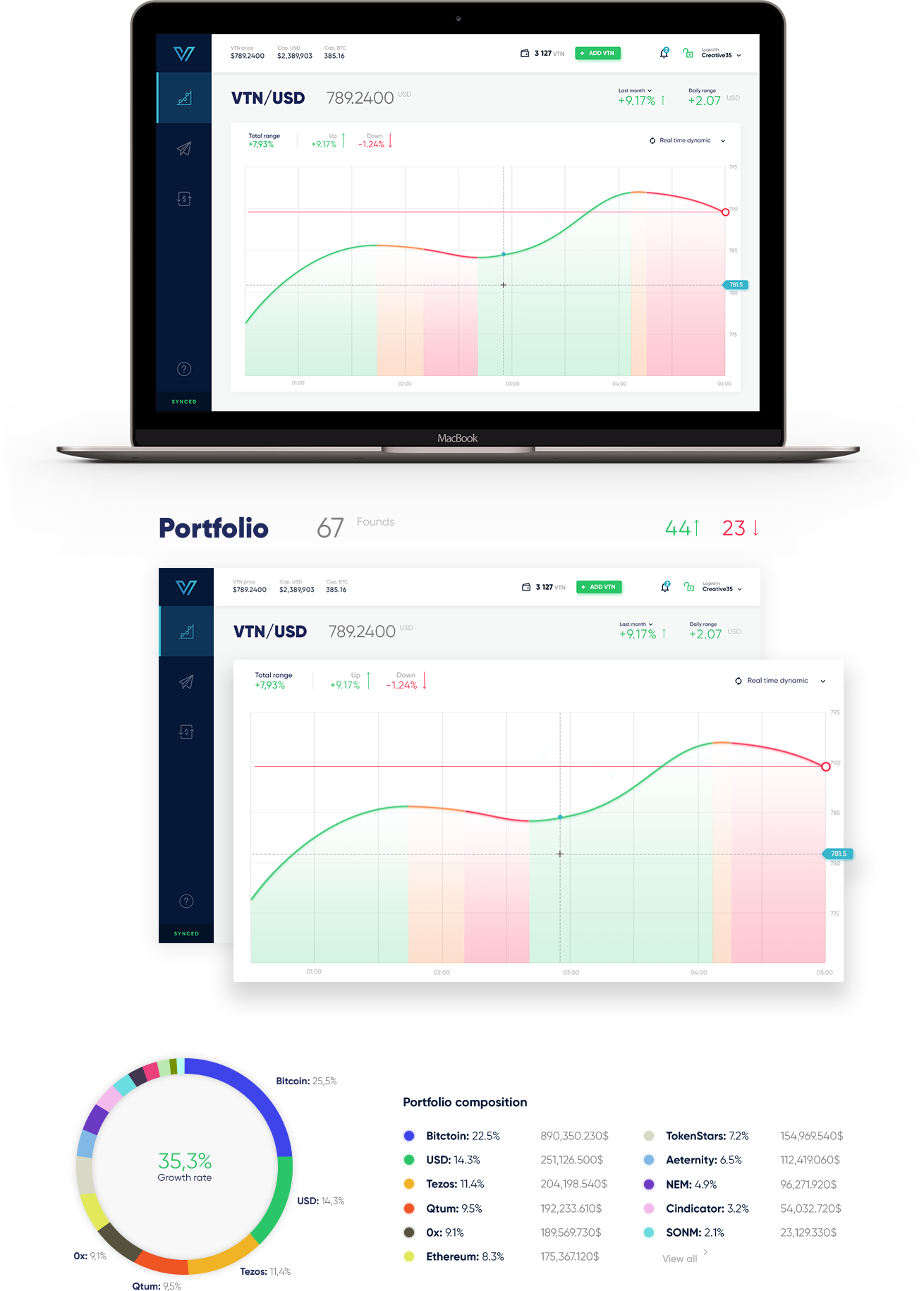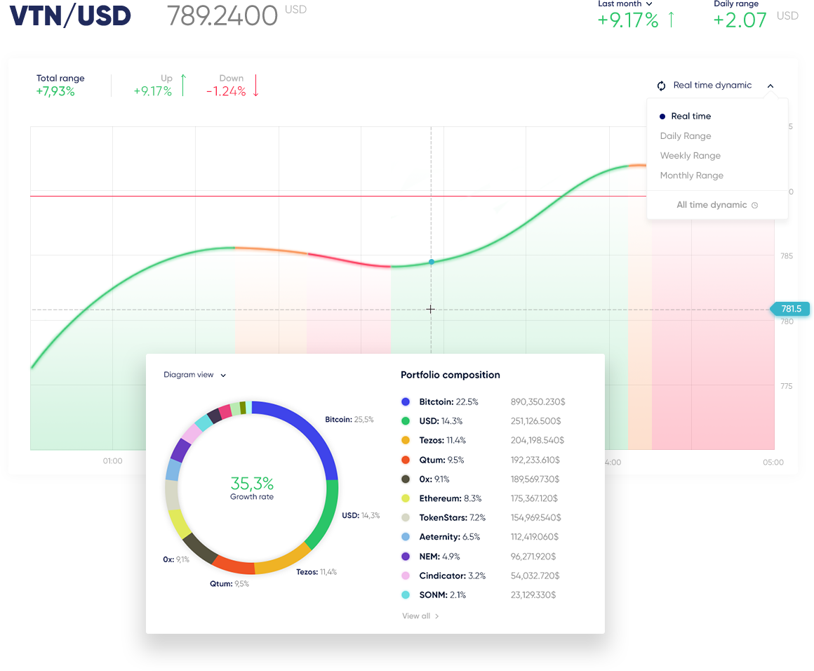 The main screen represents a graphic diagram of investment growth. Users see the Vtoken rate and growth in percentages for the specified period. Investors has the functionality to choose a convenient segment for visualizing the data, by hours or by days.