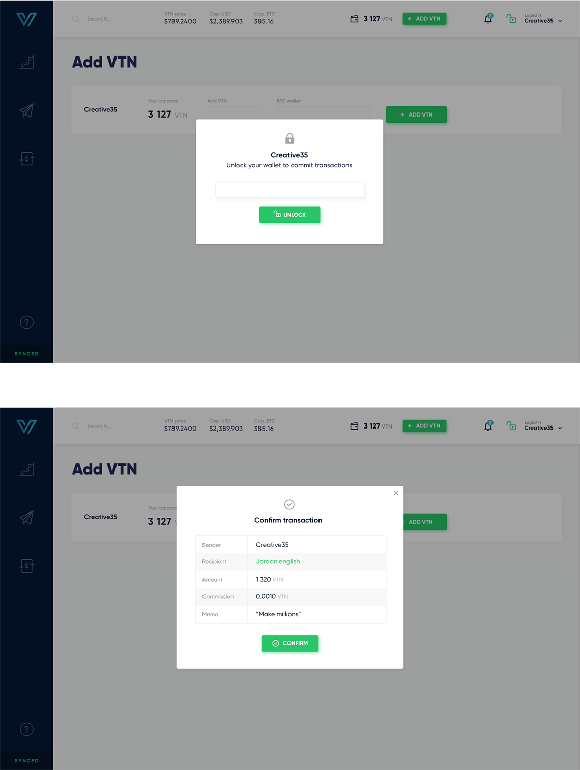 To improve the platform security, we designed several protection steps in a friendly form suggesting the user to verify data and confirm transactions with his password.